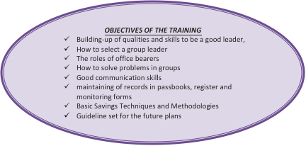 - Issues pertaining to group formation, leadership and savings were taught through interactive discussions, role plays, case studies and storytelling.
